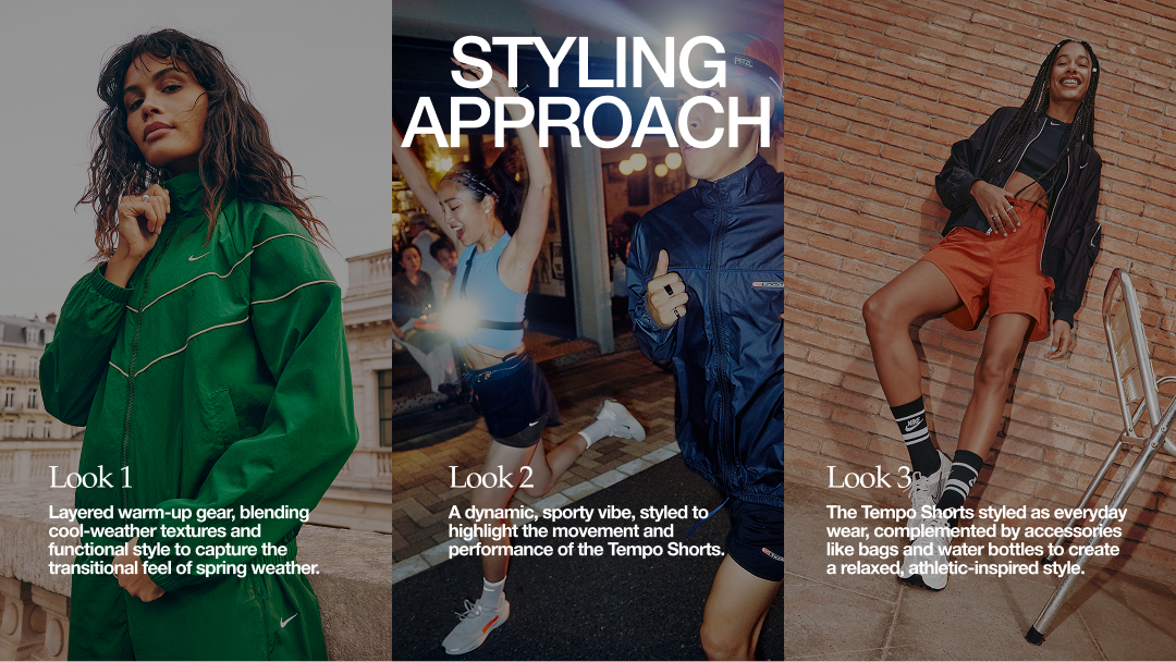 To support Nike Training’s shift toward the young female athlete, I led wardrobe styling for the launch of the updated Tempo Short, creating looks that spanned layered warm-ups, performance-driven styling, and everyday athletic wear.